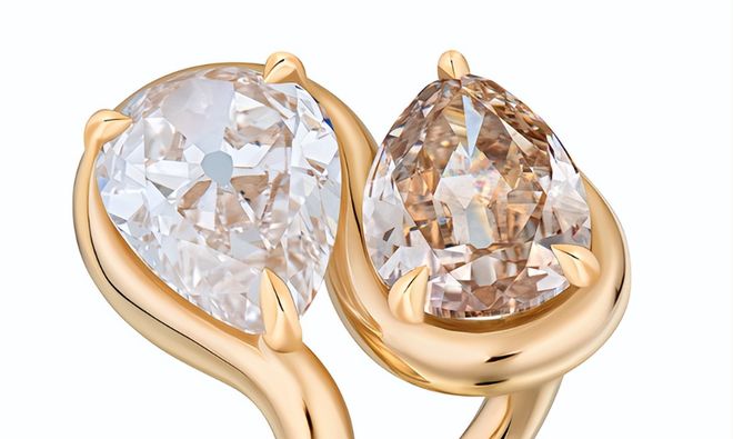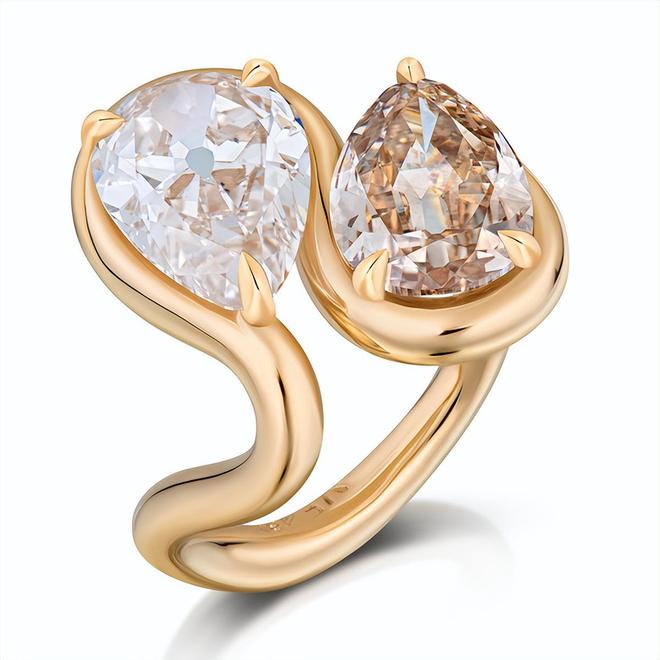 这枚黄金钻石戒指,黄金打造的戒托如同波浪般流动蜿蜒,一枚榄尖形咖钻和一枚榄尖形无色钻石镶嵌在戒指的正中,经典的双石款,款式简洁大气,呈现出一种素净温柔的现代美。