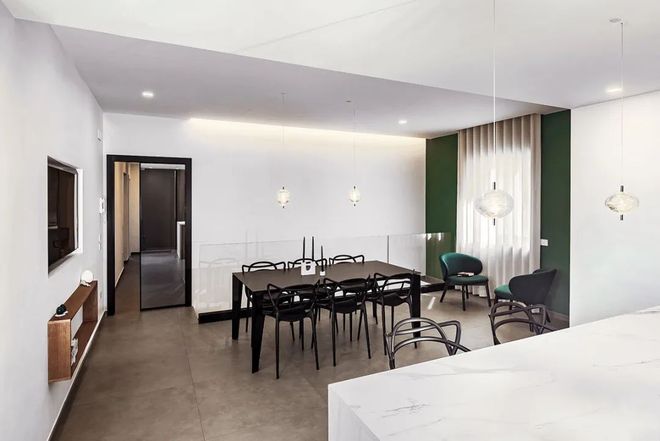 反射烟玻璃的滑动门将大型步入式衣柜隔开。完整的套间浴室将公寓的地板保留为墙面覆盖物,但淋浴间的后墙则选择了 Naxosceramiche 的非常独特且珍贵的装饰涂层。第三间浴室非常宽敞,还设有一个方便的洗衣空间,隐藏在定制的全高三门活动墙后面。这次的装饰涂层是有光泽的绿色缟玛瑙效果,给环境带来了经典的色调,而不是空间的本质和形式纯粹。在这种情况下,与客户的协同作用也产生了辉煌的炼金术,翻修的冒险尽管有起有落,但对于参与其中的专业人士和客户本身来说都是一种乐趣,他们现在似乎完全了解享受一年梦想的家!